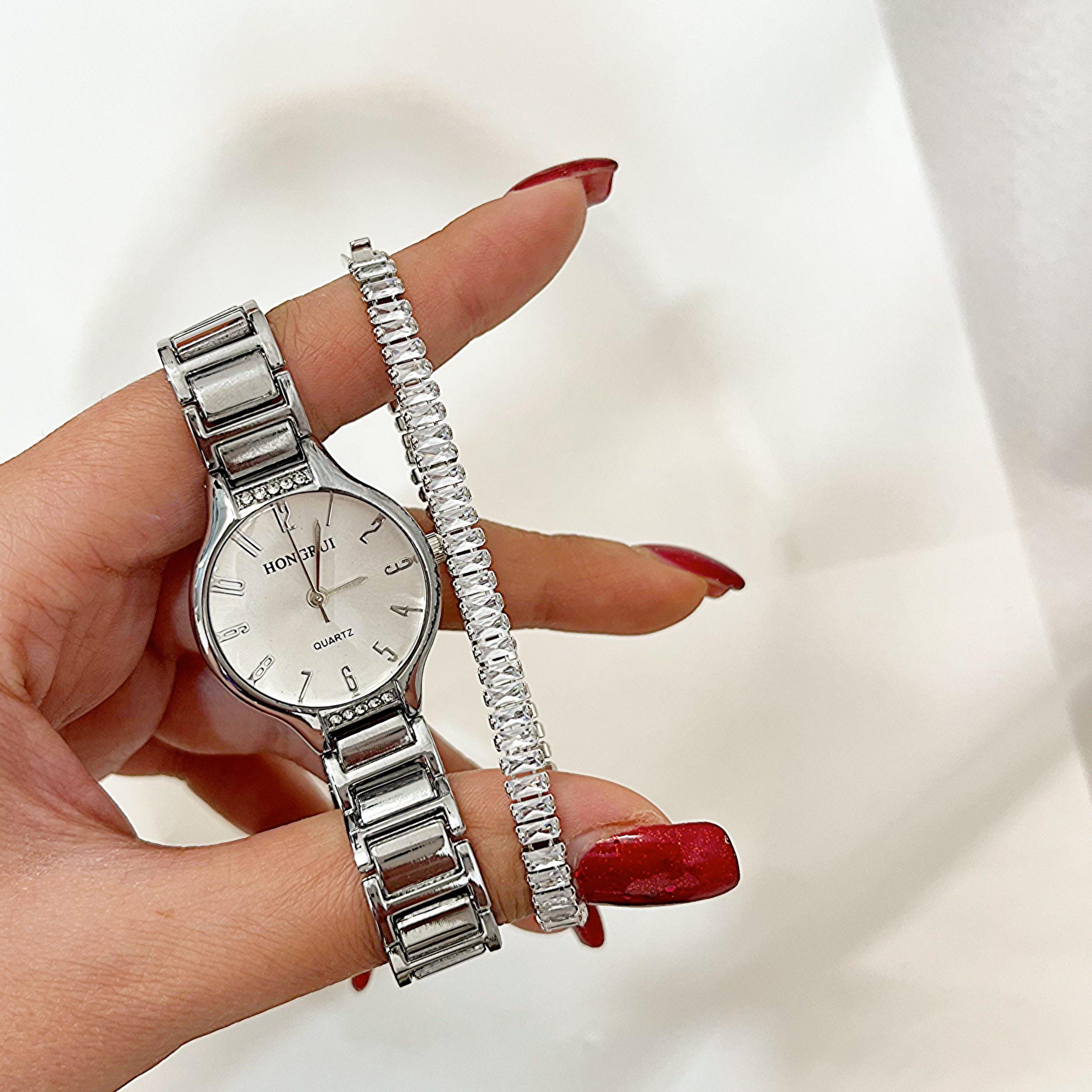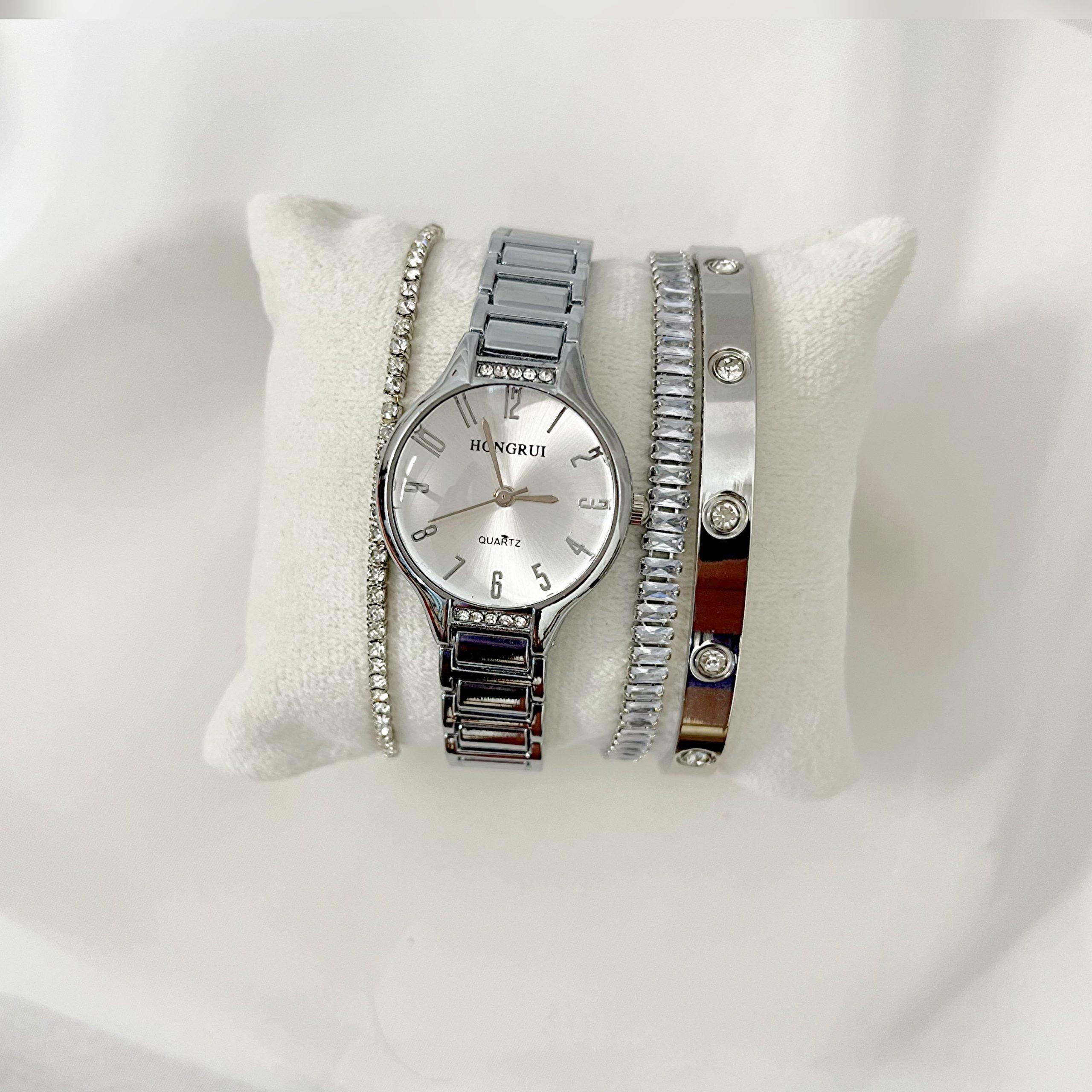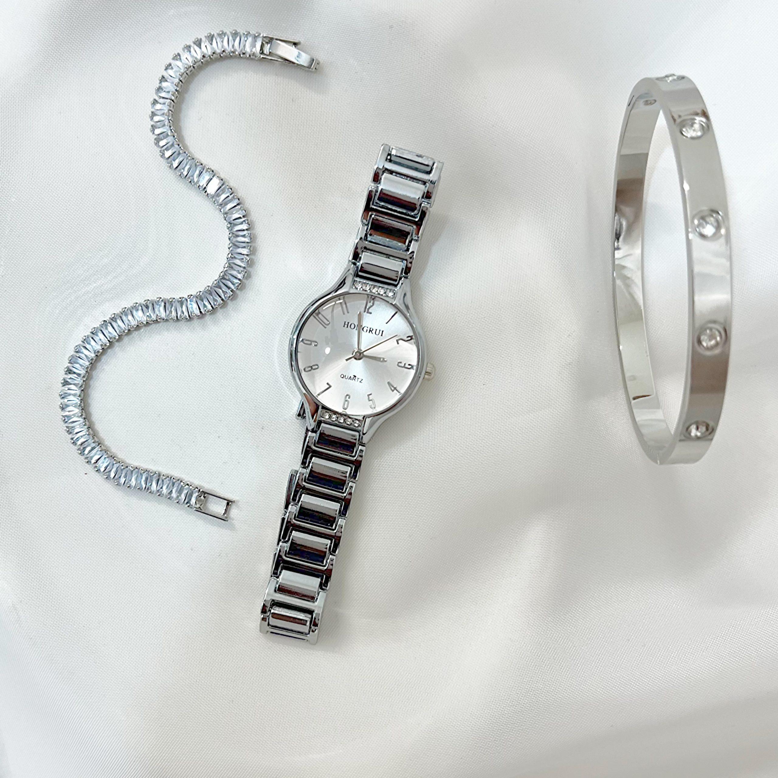 دستبند نگینی تنیسی ,بنگل کاتیر نگین دار سیلور ,ساعت سیلور صفحه سفید |